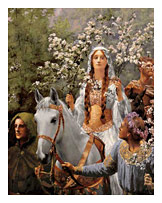 Beltaine is an anglicization of the Irish "Bealtaine" or the Scottish "Bealtuinn." While "tene" clearly means "fire," nobody really knows whether Bel refers to Belenus, a pastoral god of the Gauls, or is from "bel," simply meaning "brilliant." It might even derive from "bil tene" or "lucky fire" because to jump between two Beltane fires was sure to bring good fortune, health to your livestock, and prosperity. When the Druids and their successors raised the Beltaine fires on hilltops throughout the British Isles on May Eve, they were performing a real act of magic, for the fires were lit in order to bring the sun’s light down to earth. In Scotland, every fire in the household was extinguished, and the great fires were lit from the need-fire which was kindled by 3 times 3 men using wood from the nine sacred trees. When the wood burst into flames, it proclaimed the triumph of the light over the dark half of the year. Then the whole hillside came alive as people thrust brands into the newly roaring flames and whirled them about their heads in imitation of the circling of the sun. If any man there was planning a long journey or dangerous undertaking, he leaped backwards and forwards three times through the fire for luck. As the fire sunk low, the girls jumped across it to procure good husbands; pregnant women stepped through it to ensure an easy birth, and children were also carried across the smoldering ashes. When the fire died down, the embers were thrown among the sprouting crops to protect them, while each household carried some back to kindle a new fire in their hearth. When the sun rose that dawn, those who had stayed up to watch it might see it whirl three times upon the horizon before leaping up in all its summer glory. The Rites of Spring Beltaine was a time of fertility and unbridled merrymaking, when young and old would spend the night making love in the Greenwood. In the morning, they would return to the village bearing huge budding boughs of hawthorn (the may-tree) and other spring flowers with which to bedeck themselves, their families, and their houses. They would process back home, stopping at each house to leave flowers, and enjoy the best of food and drink that the home had to offer. In every village, the maypole—usually a birch or ash pole—was raised, and dancing and feasting began. Festivities were led by the May Queen and her consort, the King who was sometimes Jack-in-the-Green, or the Green Man, the old god of the wildwood. They were borne in state through the village in a cart covered with flowers and enthroned in a leafy arbor as the divine couple whose unity symbolized the sacred marriage of earth and sun. To Celebrate Beltaine Today Arise at dawn and wash in the morning dew: the woman who washes her face in it will be beautiful; the man who washes his hands will be skilled with knots and nets. If you live near water, make a garland or posy of spring flowers and cast it into stream, lake or river to bless the water spirits. Prepare a May basket by filling it with flowers and goodwill, then give it to one in need of caring, such as an elderly friend. Beltaine is one of the three "spirit-nights" of the year when the faeries can be seen. At dusk, twist a rowan sprig into a ring and look through it, and you may see them. Make a wish as you jump a bonfire or candle flame for good luck—but make sure you tie up long skirts first! Make a May bowl —wine or punch in which the flowers of sweet woodruff or other fragrant blossoms are soaked—and drink with the one you love. | ||||||||||||||||||||||||||||||||||||||||||||||||||||||||